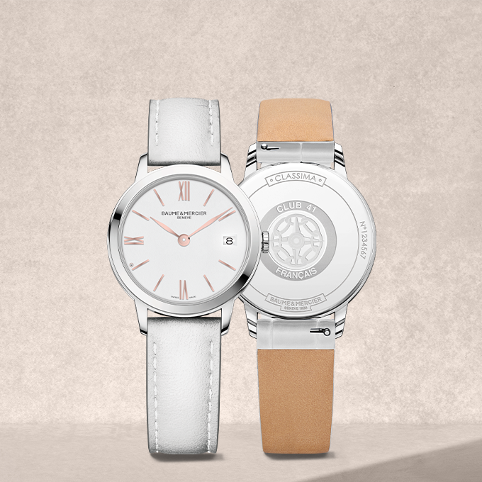 Cette montre Classima pour femme arbore un boîtier en acier, un cadran blanc épuré aux chiffres romains dorés, ainsi qu’un bracelet en cuir blanc. Son design élégant et raffiné est animé par un mouvement à quartz suisse. Le cadran est personnalisé avec un diamant positionné sur la minuterie à la minute 41. Le fond de boîte est gravé avec le logo du Club41.